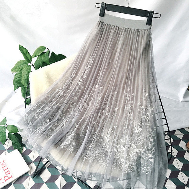 Floral Embroidery A-Line Skirt Lace Mesh Skirt